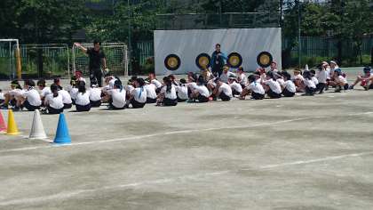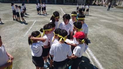 今日は、バトンパスのやり方やテークオーバーゾン内での動きの説明があり、その後、チームごとに集まって走る順番や作戦をたてました。(5月8日)