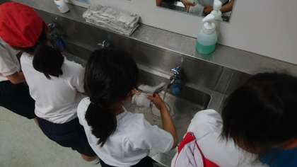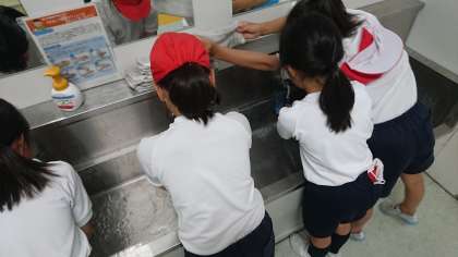 教室掃除が終わると、水バケツを用意した子どもが使った雑巾を一枚ずつ丁寧にゆすいでいました。(5月13日)