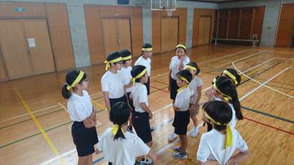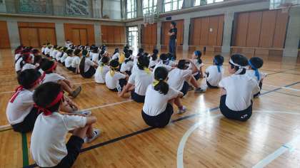 今日は、あいにくの雨で体育館でバトンの受け渡しの話し合いをさまさた。(5月14日)