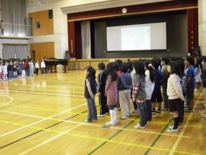2月の音楽朝会が昨日ありました。今月は、「ビリーブ」という曲で、6年生を送る会に全員で歌う曲です。復籍のお友達も来校し、一緒に歌いました。