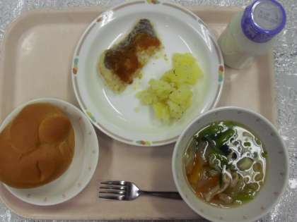 ミルクパン、魚のバーベキューソース、粉吹き芋、野菜スープ、牛乳でした。
