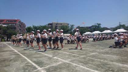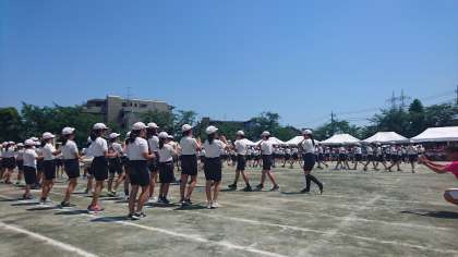1曲目は「黄色いリボン」の曲をマーチのリズムにのって演奏し、横・縦・ななめと隊形を変えていきました。2曲目は、「明日があるさ」の曲に合わせ、グループごとに各ポイントを通り、四角くまわりました。(5月25日)