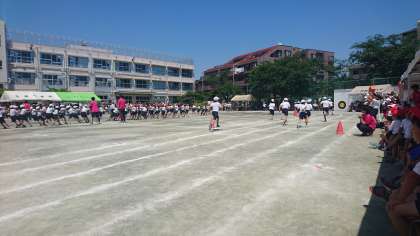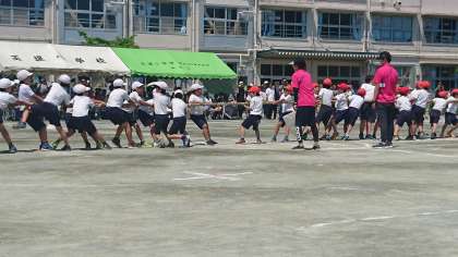 お助け綱引きは、トラック中央で行われる対戦に後から仲間が加勢しました。いかに速く仲間が助けに行けるかが勝負の見所でした。(5月25日)