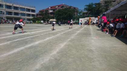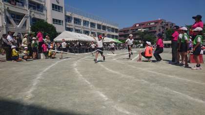 高学年の仲間入りをした4年生。コーナーを力強く駆け抜けました。(5月25日)