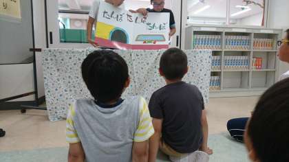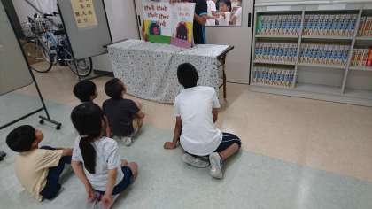 中休みに、委員会の子ども達が図書室前で本の読み聞かせをししました。(6月19日)