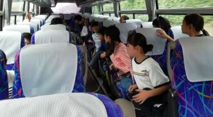 8時35分に練馬から関越自動車道に乗りました。バスレク係からのクイズが始まりました。赤くて水分が多くて種が黒い物は?ハイ!リンゴ?正解はスイカです。盛り上がっています。