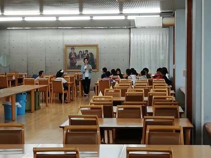 分担された係の確認を行っています。食堂で食事係が集まっています。
