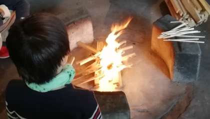火が上手につきました。何故か見つめてしまう炎。写真屋さんからありがたいお話をうかがっています。