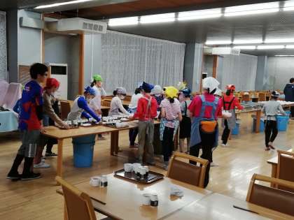 朝食の準備が始まりました。食事係が分担して仕事を進めています。