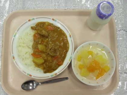 子どもたちが大好きな「カレーライス」「フルーツポンチ」牛乳でした。これは、6年生のリクエスト給食の第2位でした。