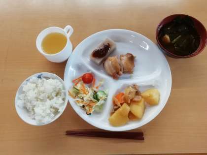 晩御飯の献立は、鶏の照り焼き・味噌田楽・にくじゃが・サラダ・ご飯・リンゴジュース・お味噌汁です。