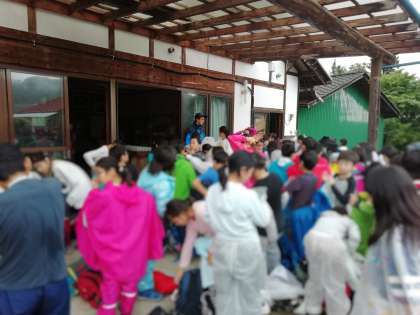 小雨の中、村めぐりをしました。関リンゴ園さんでリンゴジュースをいただいて休憩しました。美味しいジュースをいただいたあとに、リンゴ栽培の一年間の作業についてうかがいました。