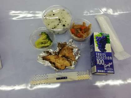 三日目の昼食の献立は、わかめごはん・きんぴらごぼう・ブロッコリー・鶏の唐揚げ グレープジュースです。