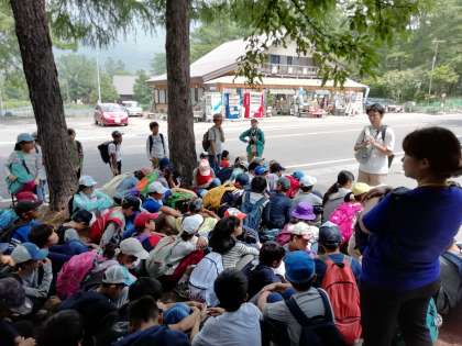 お弁当を受け取り、班ごとに食事です。このあと、バスで龍頭の滝に向かいます。