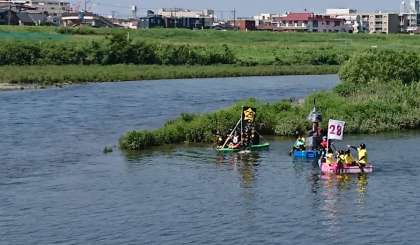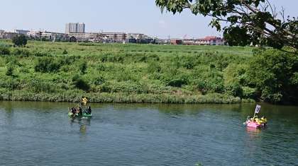 男子チーム「玉堤☆スピードスター」は第6レースです。出艇前は緊張しながらも、笑顔を見せていました。他のチームとは違う、川崎側のコースを取り、優雅にレースを楽しんでいました。