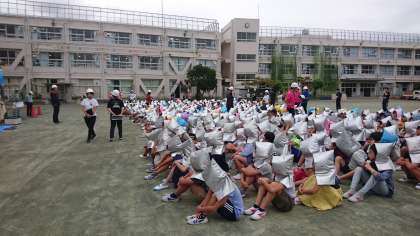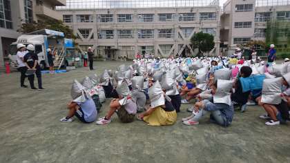 今月の避難訓練は、地震を想定しました。四年生は起震車で震度7を体験しました。(9月13日)