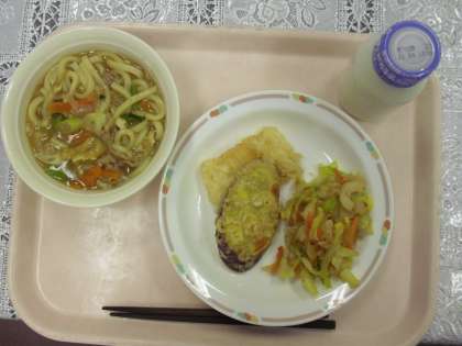 今日のメニューは、カレーうどん、天ぷら、糸寒天ゴマ和え、牛乳でした。