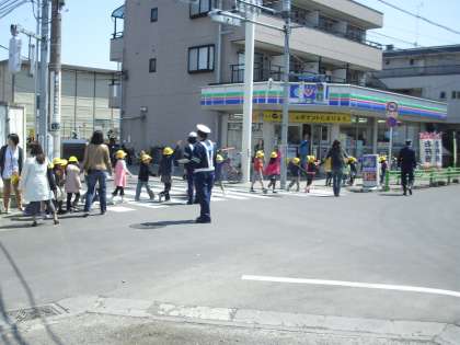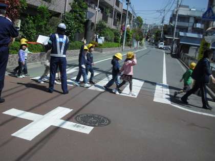 歩道や横断歩道、信号機のある交差点と仲間と一緒に歩きました。みんなよくできました。遠足も大丈夫です。