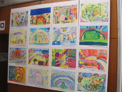 「えのぐじまってどんなしまだろう?」絵の具が吹き出ていたり、いろんな色があったりする事を創造しながら描きました。色を混ぜ、大きく描いたそれそれの「えのぐじま」を、ぜひご覧ください。