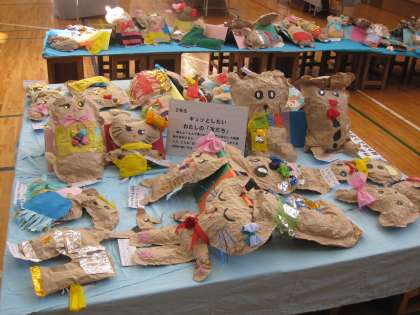紙をよくもんで柔らかくし、袋にして新聞紙を詰めこむとふっくらとしたぬいぐるみができあがりました。どんな「お友だち」にするか考え、形や色を工夫して作り上げました。