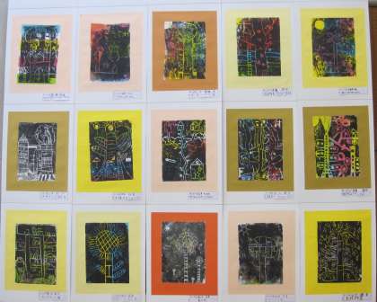 彫刻刀を使って、板を彫る練習をたくさんしました。その後、不思議な花に思いを広げて、時間を掛けて彫り進めていきました。ローラーにインクを付けて、刷り上げました。インク刷りを何度も挑戦し、一番気に入った作品を選んで展示しています。