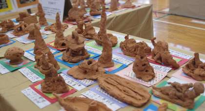 粘土のかたまりをいろいろな形に変えながら、作り方をためしたり、見つけたりして、どんな世界を表したいかを考えて作りました。テラコッタ粘土を焼き上げた作品です。