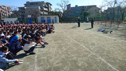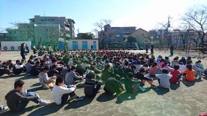 今日は、休み時間中の避難訓練を行いました。みんな、校庭で遊んでいる子ども達は、放送をよく聞き、素早く校庭の中央に集まりました。(2月5日)