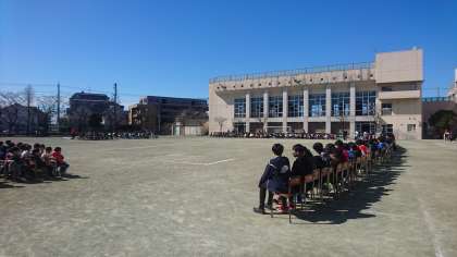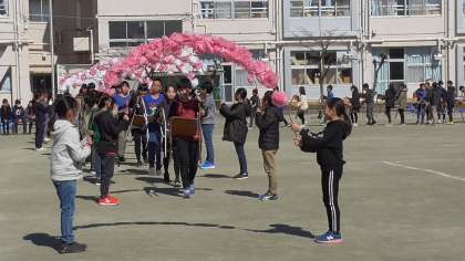 校庭で6年生をおくる会が行われました。各学年、工夫を凝らした出し物でした。(2月28日)