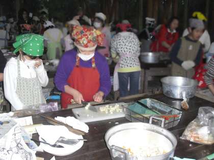 雨の中、飯盒炊爨の用意です。カレーを作りました。