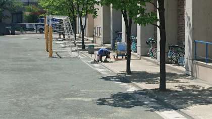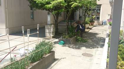 あたたかくなって、学校の植物も新しい命が芽生えてきています。休校中の間、主事さんが校庭や校舎内の整備を行っています。今朝は、植物の世話をしていました。(5月7日)