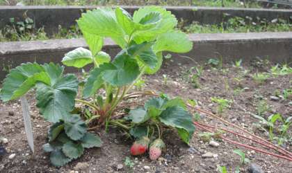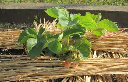 テラスベーリーが長い蔓をはわせ、赤い実をつけていました。大切に育てるために藁を敷きました。