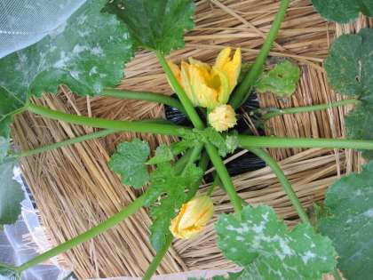 校舎沿いの畑に植えたズッキーニのお花とめ花が咲きました。違いが写真からわかるでしょうか。(5月20日)