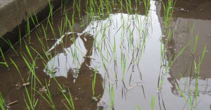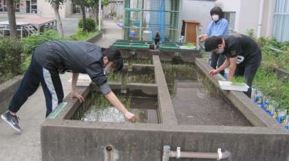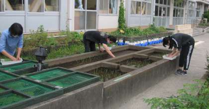 理科室で育てていた稲が大きく成長したので、5年担任と理科支援員で田植えをしました。本当は、5年生の子どもたちと一緒にやりたかったのですが…。