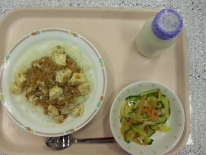昨日のメニューは、麻婆豆腐丼、パリパリサラダ、牛乳でした。