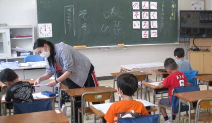 今日から授業が再開しました。1年生Aグループ、4年生Aグループの子どもたちです。