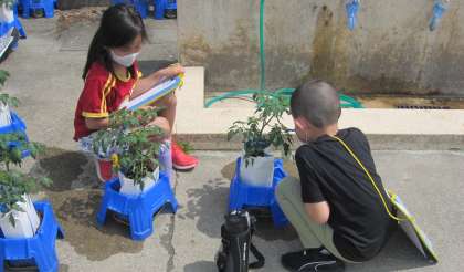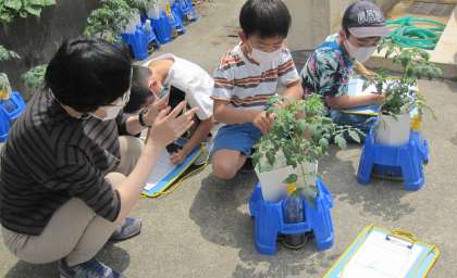 ミニトマトの観察をしています。大きさ・形・色を見る、長さを測る、匂いをかぐ、触るなどをして丁寧に観察して記録していきます。(6月4日)