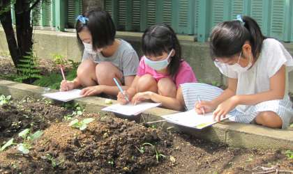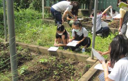 「季節と生き物の様子」について学習しています。これから1年間、植物の成長と気温との関係について調べていきます。今日はヘチマの葉の形や色、茎の長さなど熱心に観察し、気が付いたことを観察カードに記録していました。(6月9日)