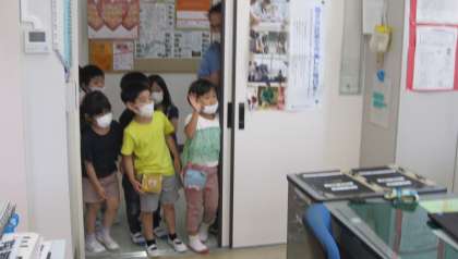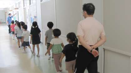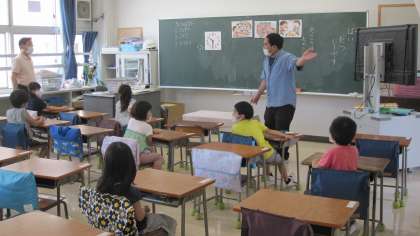 はじめての道徳の授業。今日のテーマ—は『楽しい学校』です。授業、給食、休み時間の遊び…。実際に校舎の中を探検しました。職員室にも顔を出していました。(6月11日)