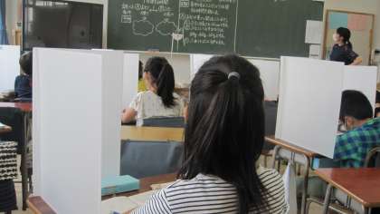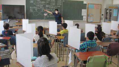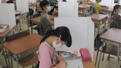 課題「ふりこが1往復する時間は、何によって変わるのだろうか」の解決に向けて、先週立てた実験計画を基に実験を進めていました。感染リスク低減のためにパーテーションを活用しています。黒板がよく見えるように、机を斜めにしたり黒板を上に上げたりするなど、工夫をしています。(6月12日)