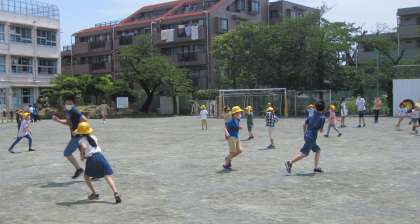 1年生と6年生が一緒に鬼ごっこをしています。例年、1年生のお世話から始まる6年生の学校生活ですが、今年度は遊びの交流からスタートです。6年生も思い切り楽しんでいました。