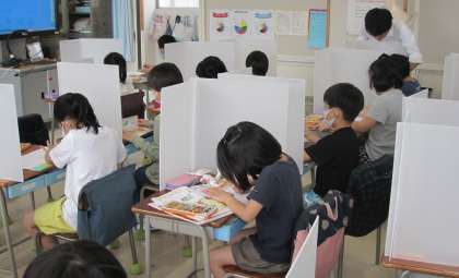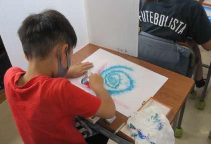 「ぼかし遊び」の学習をしています。テーマは『ゆめの せかい』です。丸くこする術、混ぜ合わせの術、渦巻きこすりの術など、伝授された術を使って、各自の夢の世界を描いていました。