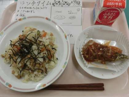 今日の給食は、こぎつねずし、牛乳、あじの甘酢あんかけです。