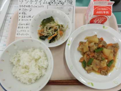 今日の給食は、ごはん、牛乳、五目うま煮、かりじゃこサラダです。