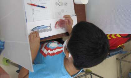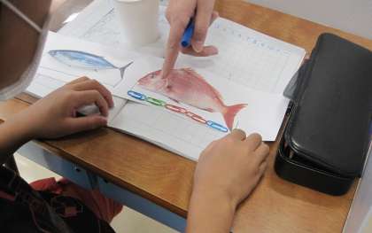 問題:カツオとタイの長さはどちらが長いでしょうか。 ブロックやクリップ、1円玉を使って、いくつ分で表すことができるか、操作をしながら学んでいました。