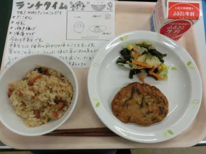 今日の給食は、たこめし、牛乳、瀬戸揚げ、海藻サラダです。