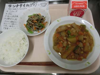今日の給食は、ごはん、牛乳、豆入り筑前煮、磯和えです。