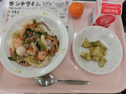今日の給食は、中華丼、牛乳、青のりポテト、冷凍ミカンです。