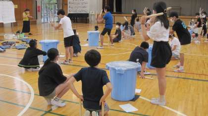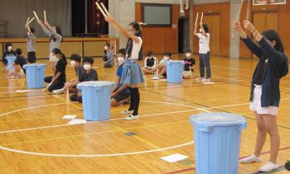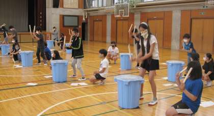 「龍神太鼓」の学習に取り組んでいます。学校行事が制限されている中、子どもたちの心に残り、達成感がある取組として「1年生に披露する」という場を設定しました。6年生は、さらに意欲的に練習に励んでいます。太鼓は大型のバケツを利用して作成しています。図工の授業で条幅紙に墨で龍神を描き、太鼓の装飾をします。