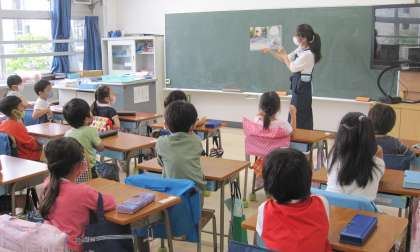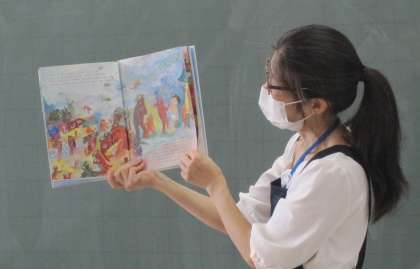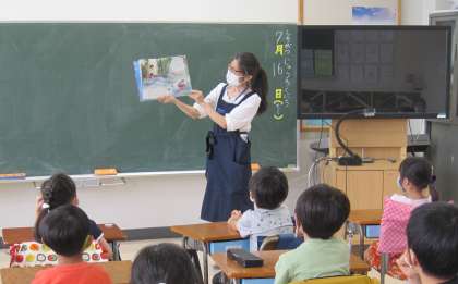 図書館司書が読み聞かせをしています。迫力のある感情を込めた朗読に子どもたちは、絵本の世界へひき込まれていきました。