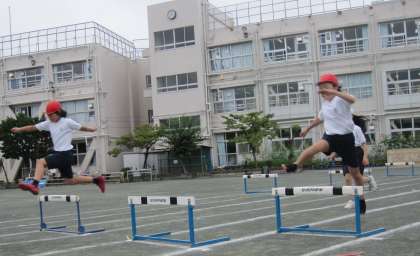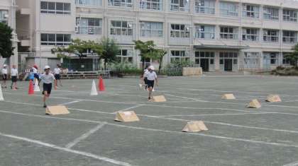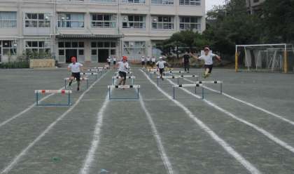 陸上運動「ハードル走」の学習をしています。段ボールの場でリズムをつかみ、ハードルの場では、全力でリズミカルに走ることができました。